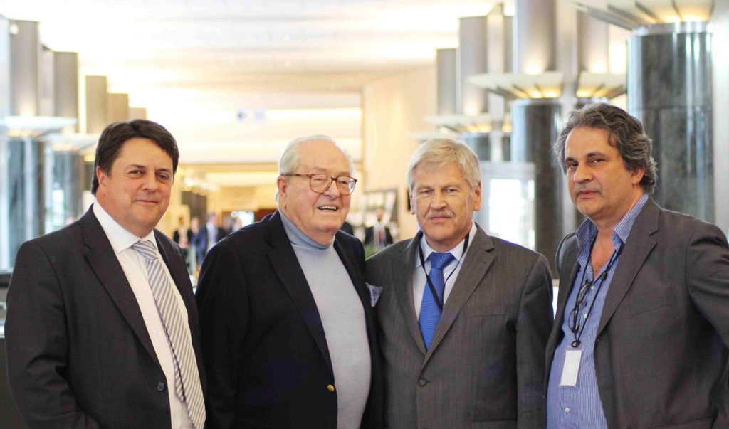 Jean-Marie Le Pen accompagné des ténors de l’APF : Udo Voigt, Roberto Fiore et Nick Griffin