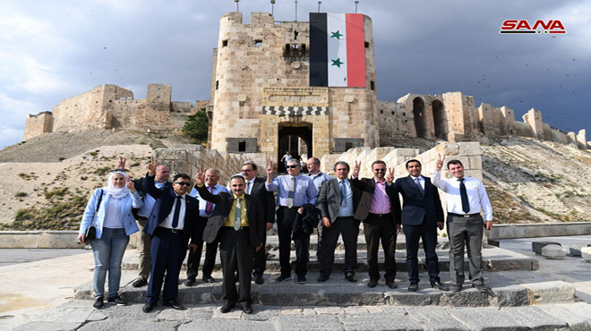 La délégation a aussi eu l’occasion de se rendre par avion spécial dans la ville martyre d’Alep, récemment totalement libérée des milices djihadistes. Les représentants de l’APF ont été énormément sollicités par la presse arabe mais aussi internationale. Notons que notre ami Hervé, qui participait bien évidemment à ce voyage, a été souvent cité dans cette presse. Sa présence répétée en Syrie a également été soulignée à plusieurs reprises par les autorités qui ont reçu les représentants de l’APF.