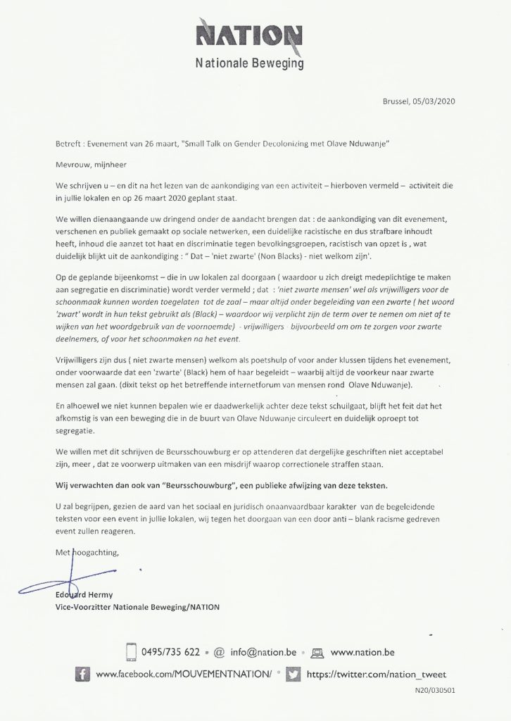 NATION vient d’envoyer ce courrier, en néerlandais, à la direction de la salle où cela doit se dérouler. Nous vous tiendrons au courant des réactions éventuelles et de la suite des événements.