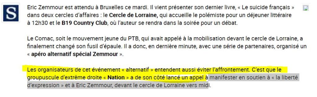 En Janvier 2015, les jeunes du PTB annulent un rassemblement contre Eric Zemmour à l’annonce que NATION sera présent pour défendre la liberté d’expression.