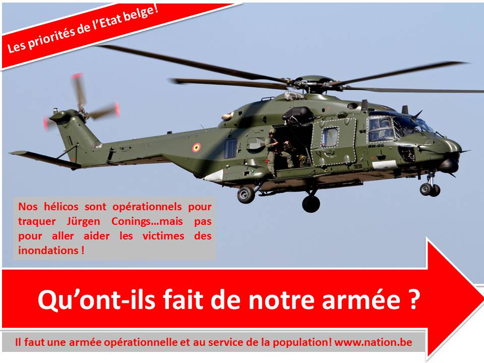 Aucun plan d’évacuation n’était prévu, les autorités se contentant de dire à la population d’évacuer, risquant ainsi d’ajouter du chaos au chaos. De même, on a vu peu d’intervention des Forces Armées. Les hélicoptères ne pouvant d’ailleurs pas intervenir immédiatement, à cause du mauvais temps. Ce qui signifie donc qu’ils ne sont pas équipés d’un matériel de pilotage tous temps…Il ne nous reste plus qu’à espérer que conflits et catastrophes ne se déroulent uniquement que par temps clair…On constatera que pour traquer Jürgen Conings, l’armée n’avait pas eu autant de soucis pour mobiliser hommes et matériel !