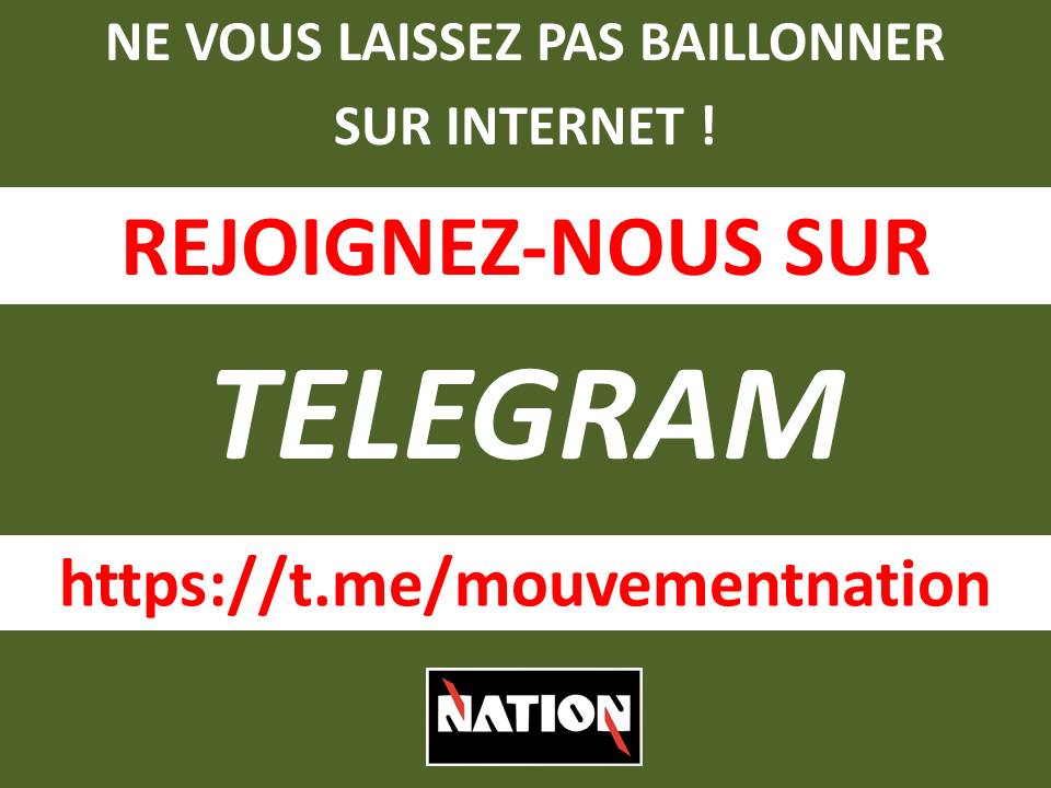 Toutes ces tentatives de censures nous rappellent qu’il faut de plus en plus se tourner vers des réseaux sociaux encore un peu libres tels que Telegram où NATION dispose d’ailleurs d’un canal : https://t.me/mouvementnation
