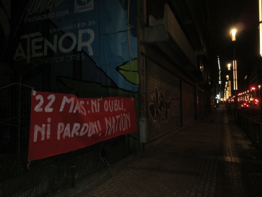 Pour l’anniversaire des attentats islamistes du 22 mars, NATION accroche pendant la nuit une banderole à l’endroit où toutes les autorités vont venir se recueillir hypocritement